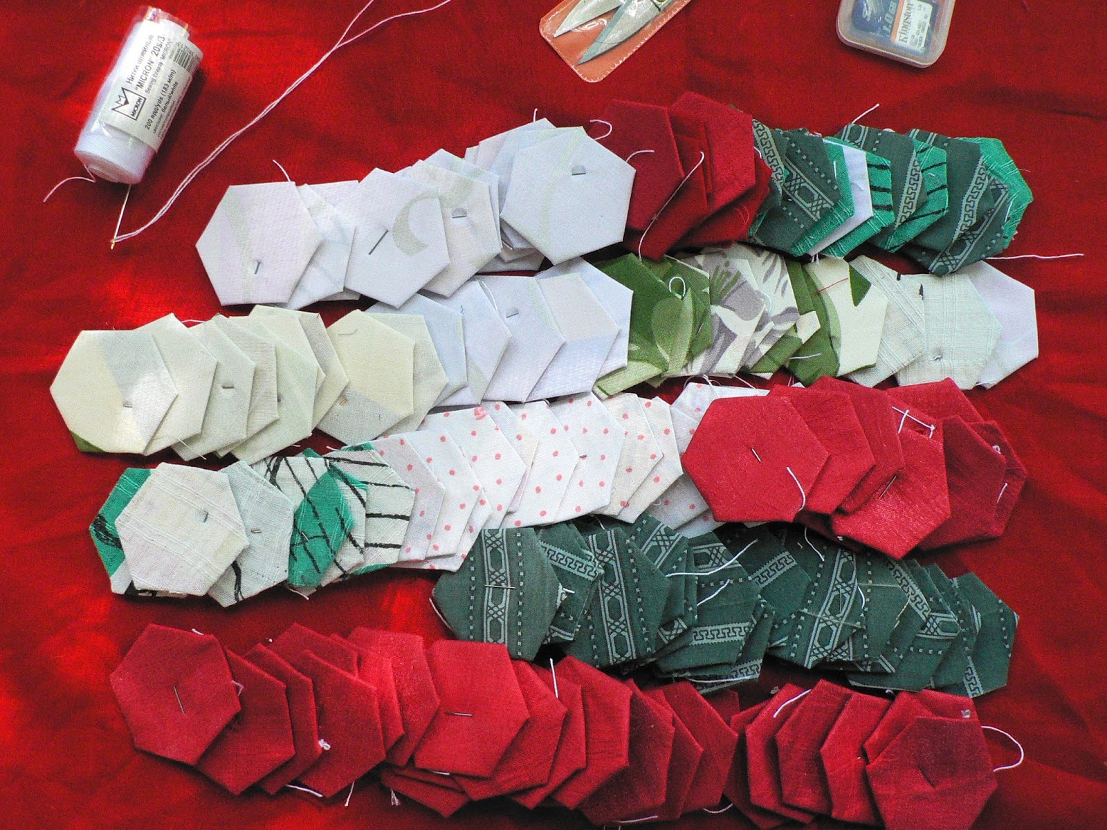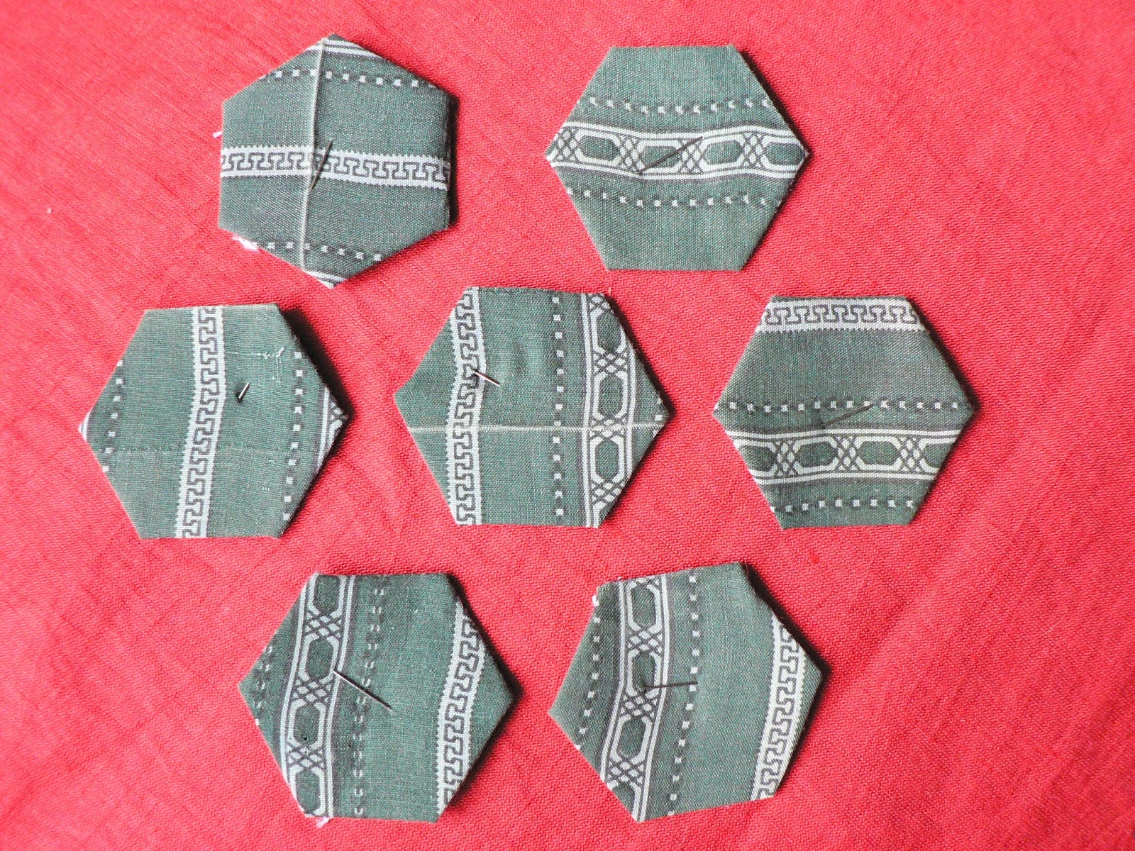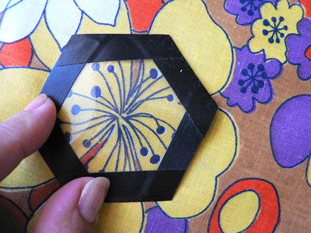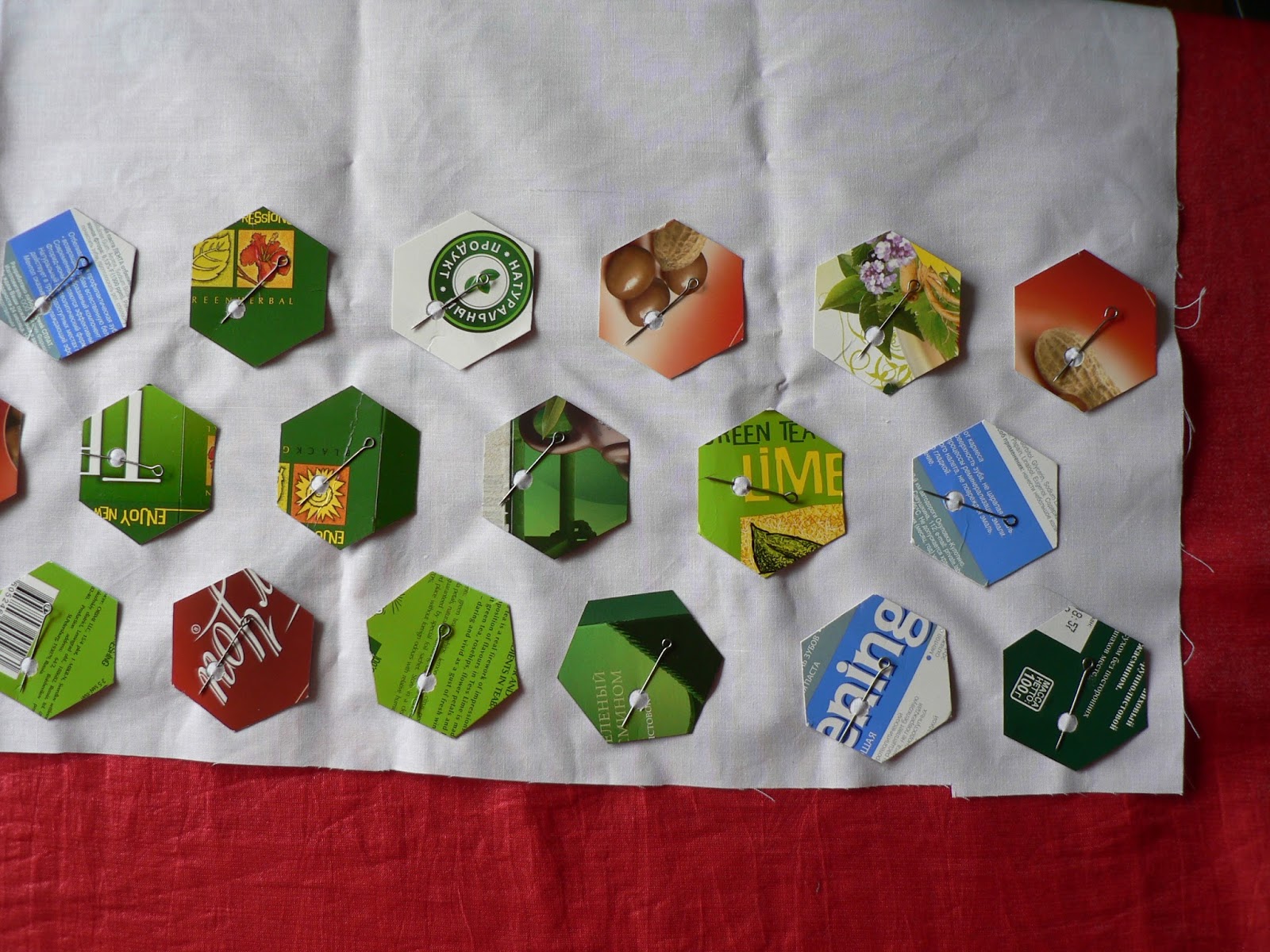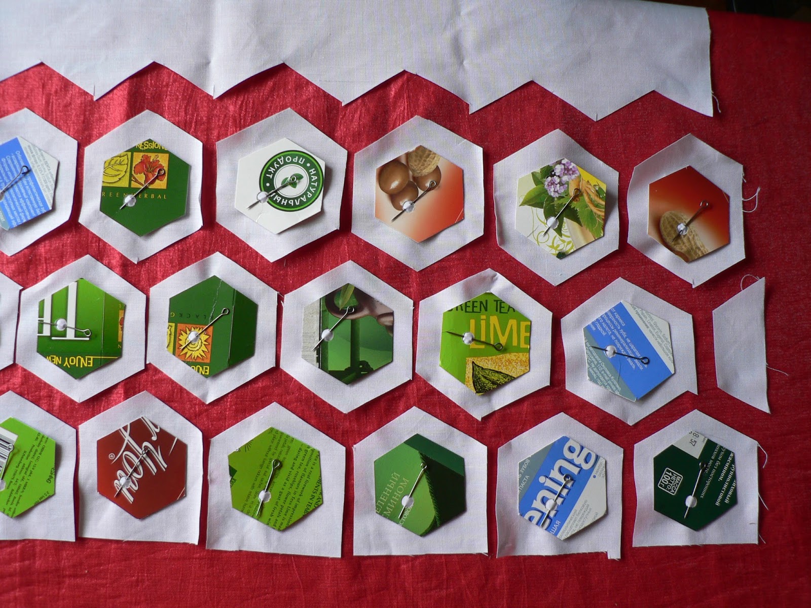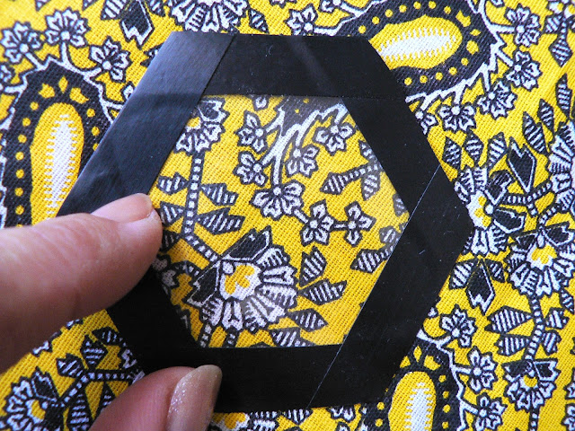 Некоторые даже не обрезают ткань по форме гексагона, лишь бы был достаточный припуск на подгиб. На большом полотне я раскладываю гексагоны сотами - в шахматном порядке.