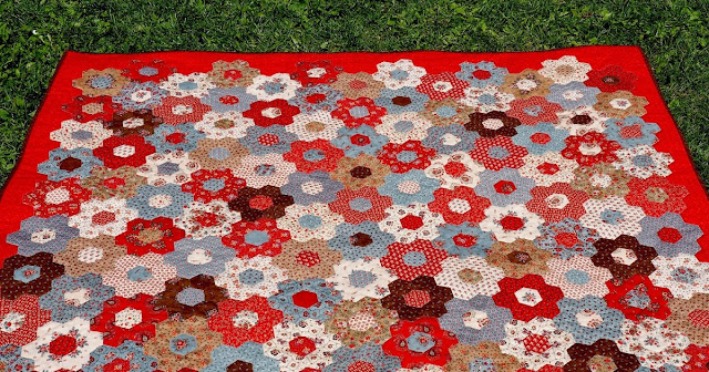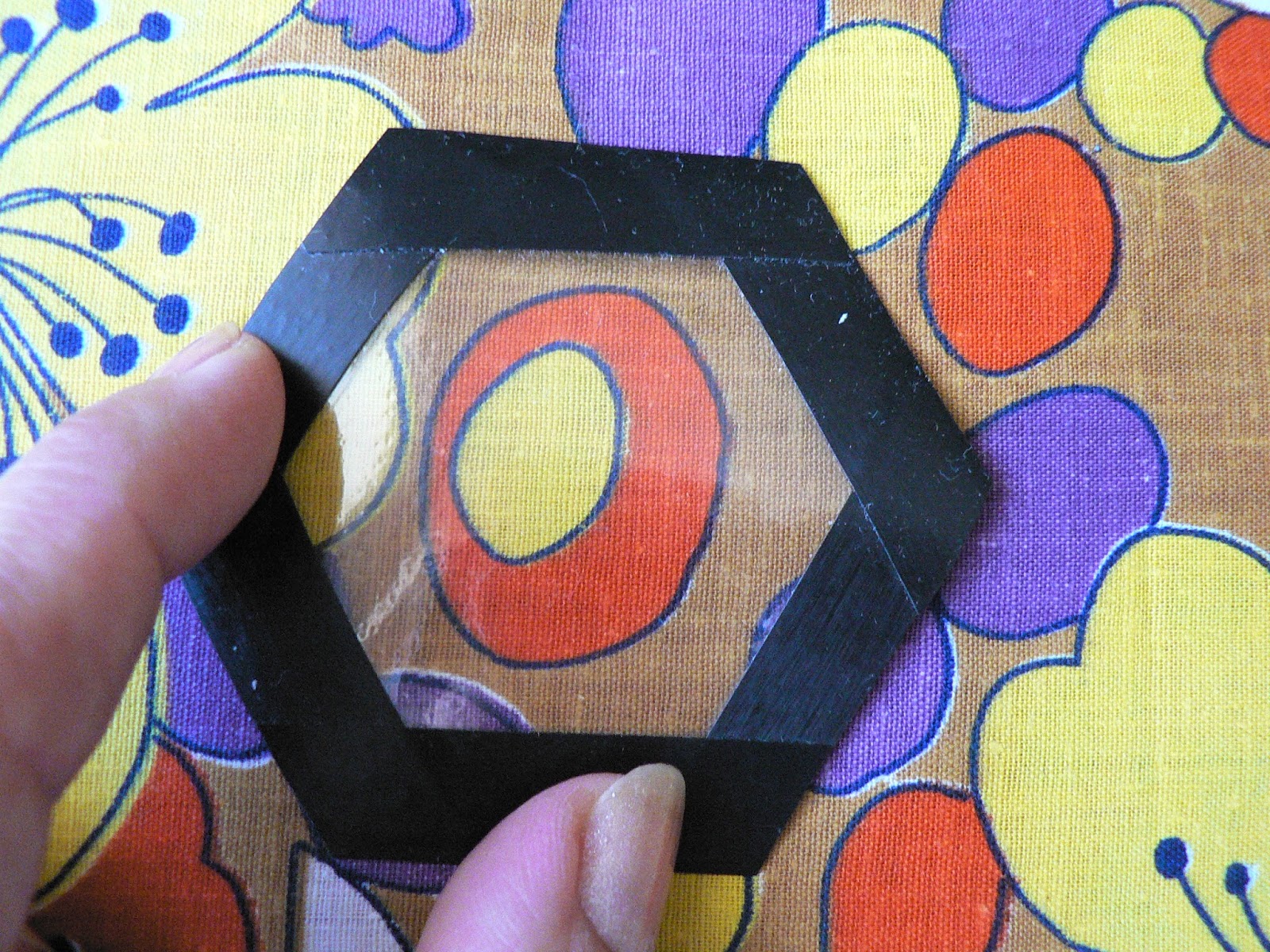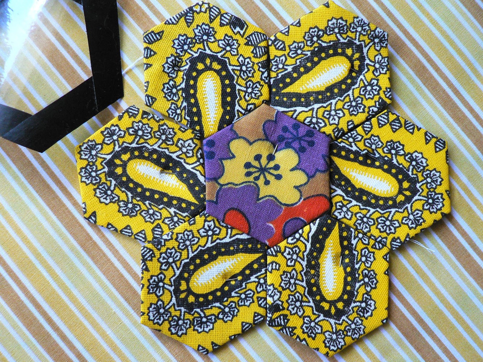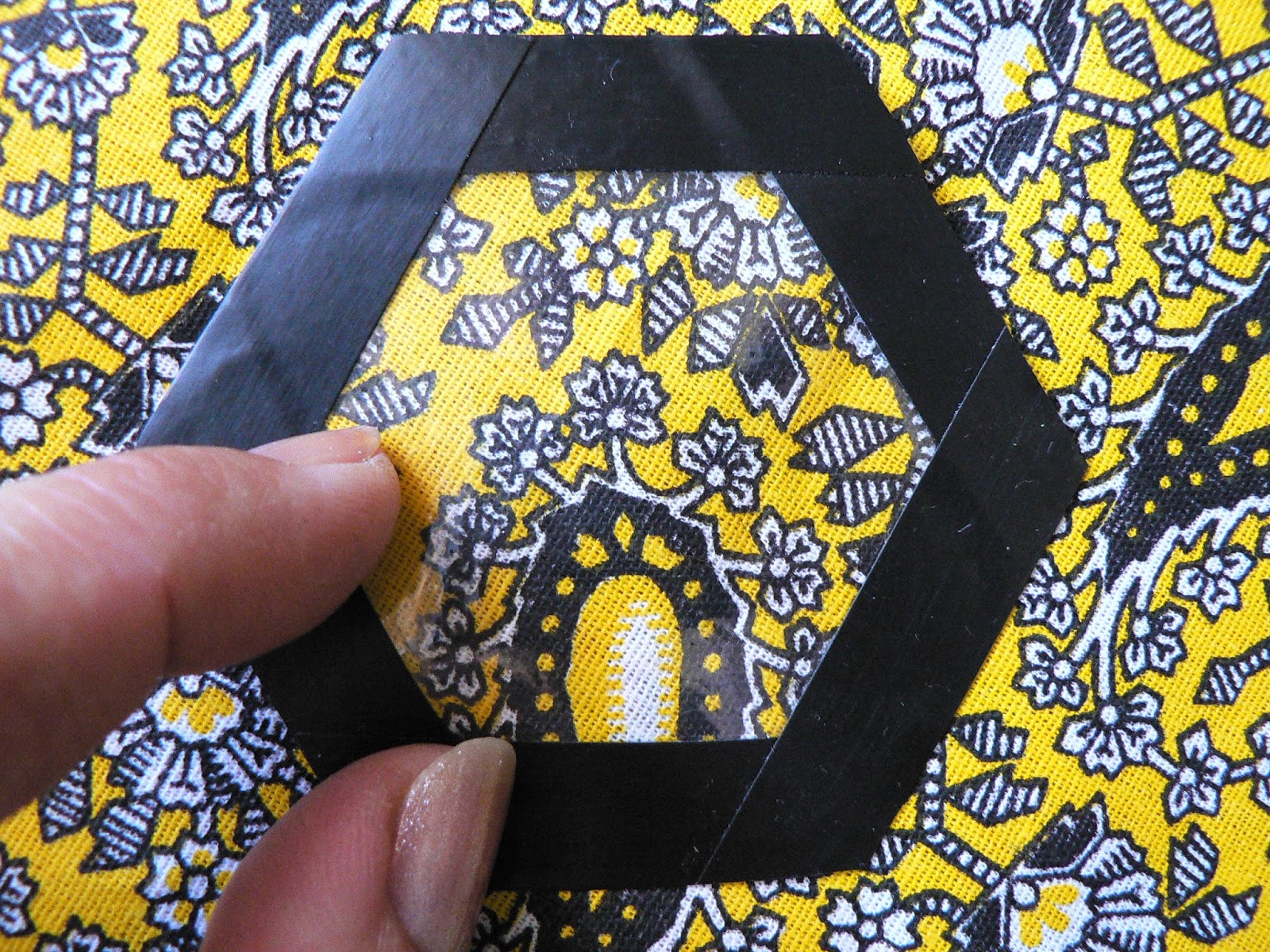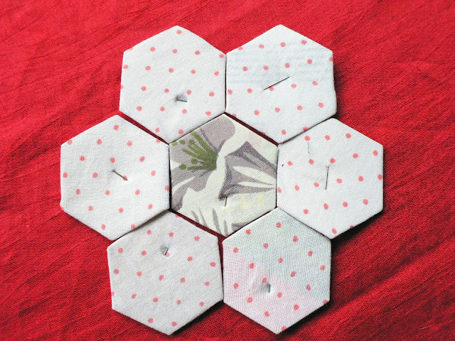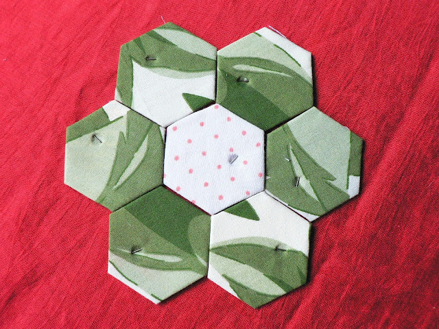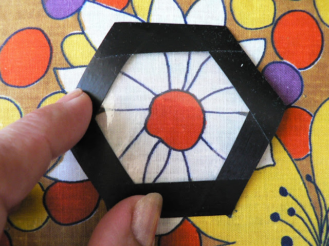 Некоторые даже не обрезают ткань по форме гексагона, лишь бы был достаточный припуск на подгиб. На большом полотне я раскладываю гексагоны сотами - в шахматном порядке.