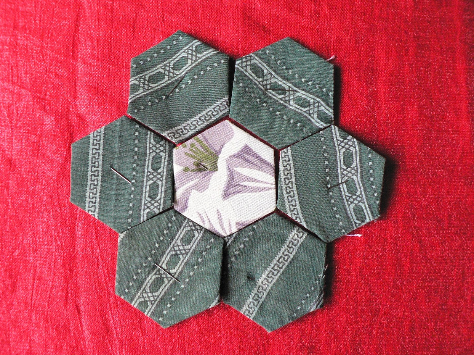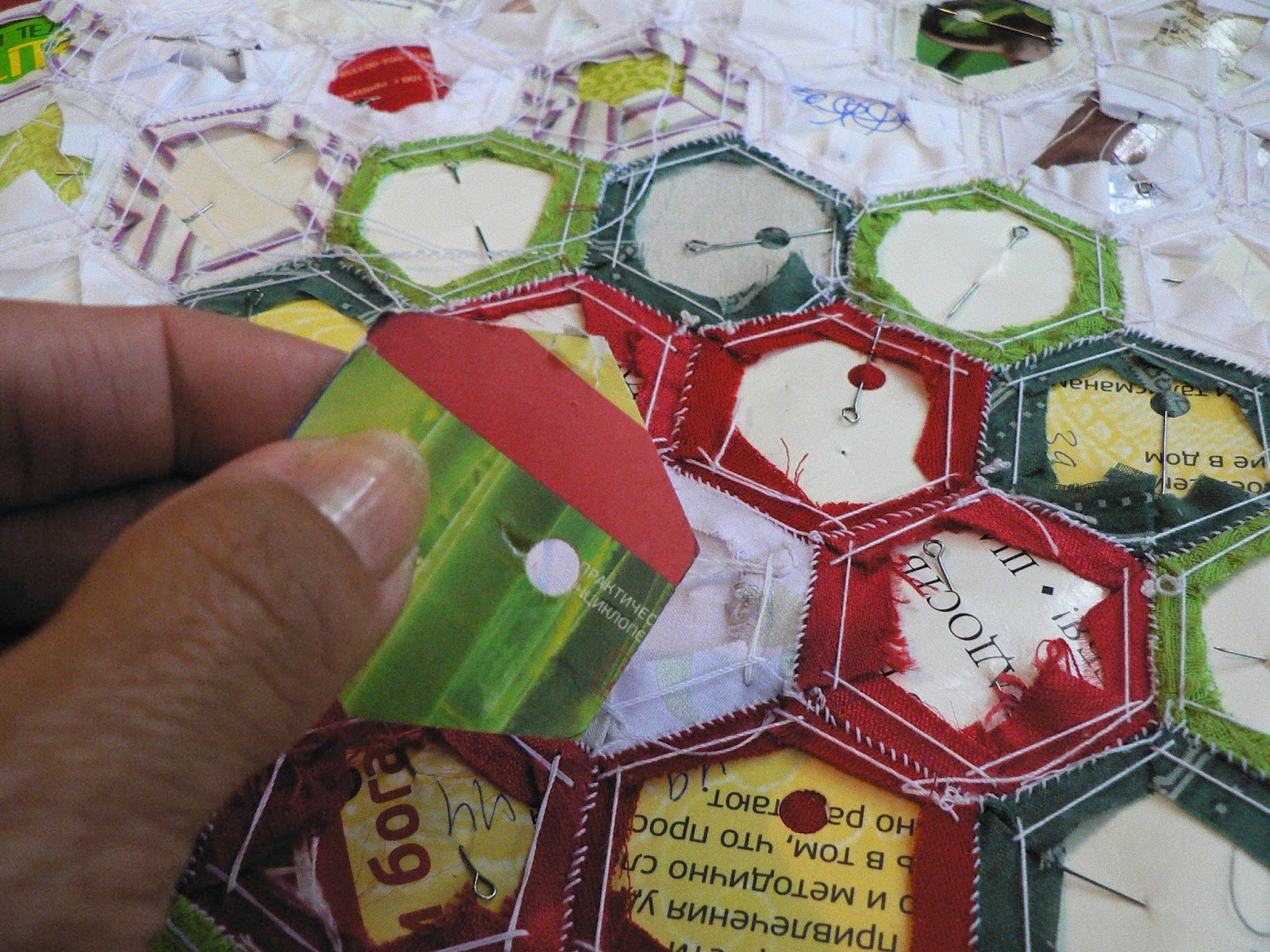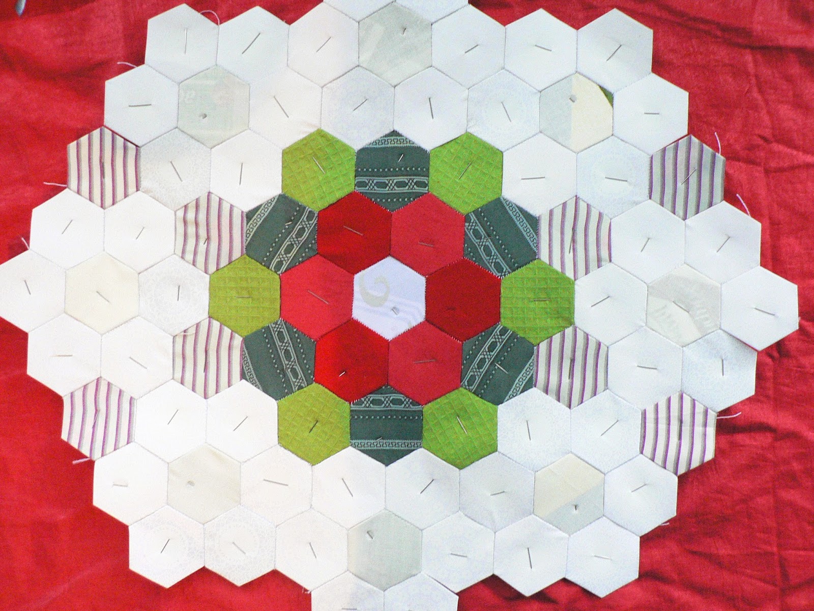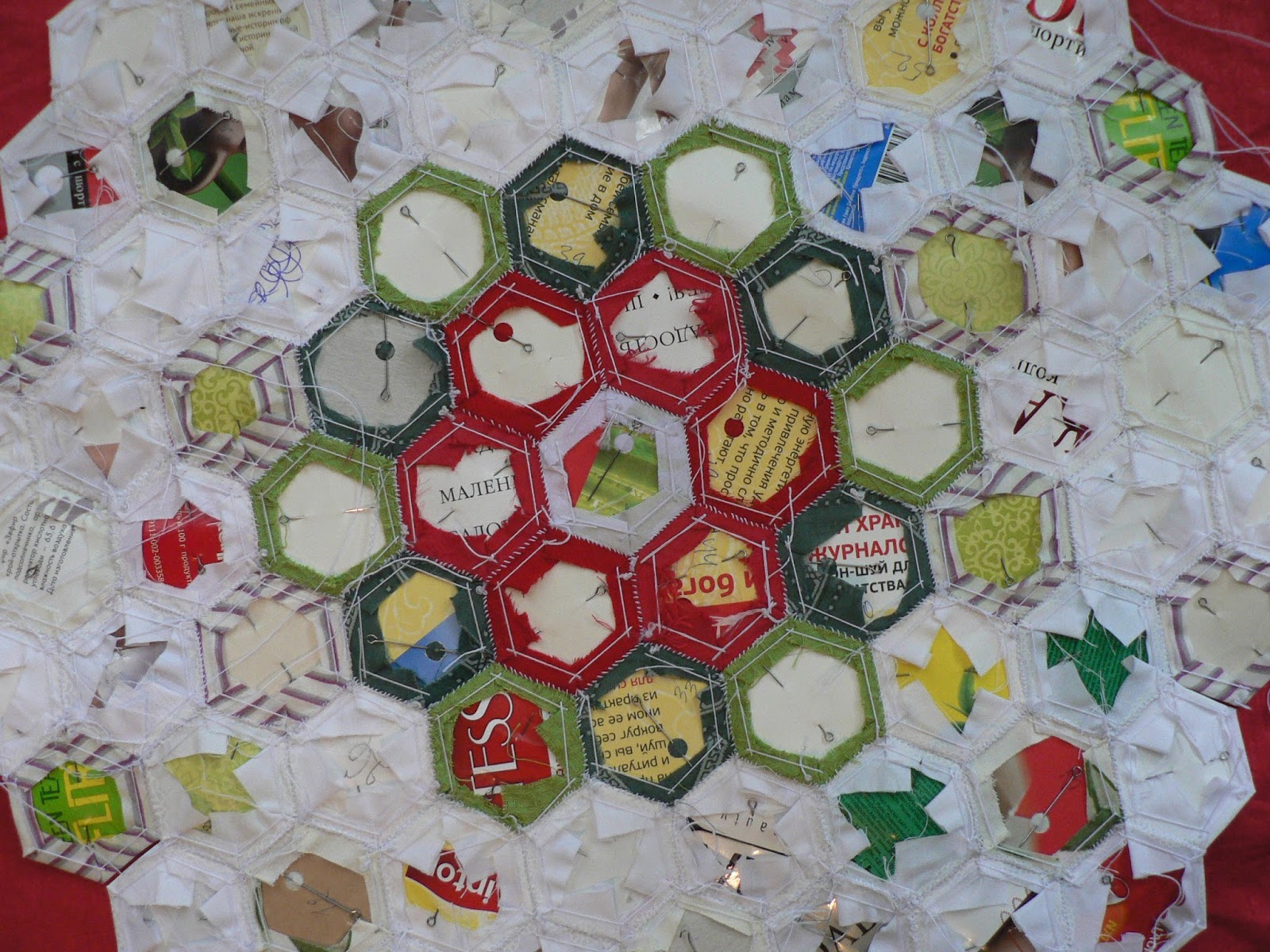 Если лоскутное полотно у Вас большое, вынутые из центра полотна шаблоны могут быть использованы на крайних рядах. На моём примере гексагоны можно без ущерба вынуть из цветочка и зелёных листиков, белые крайние ряды, желательно, оставить не тронутыми, к ним будут добавлены ещё красные цветы: