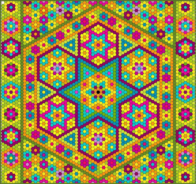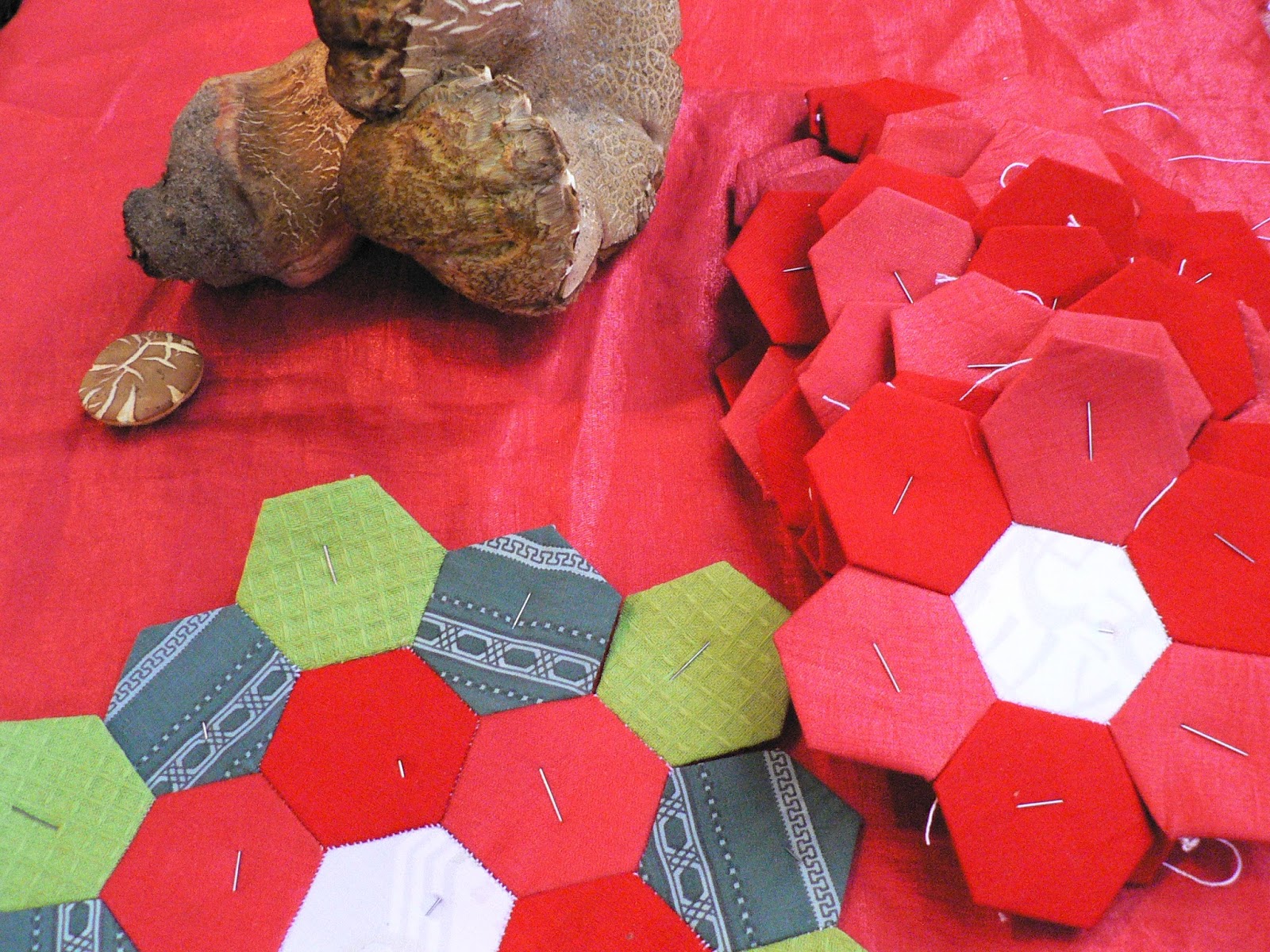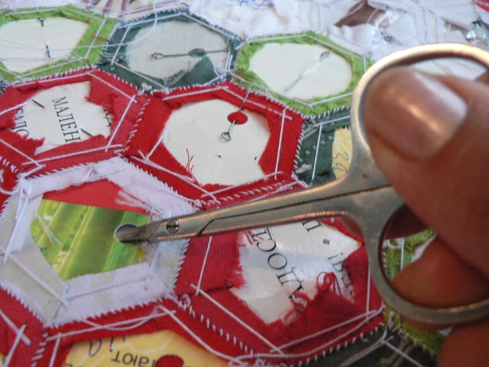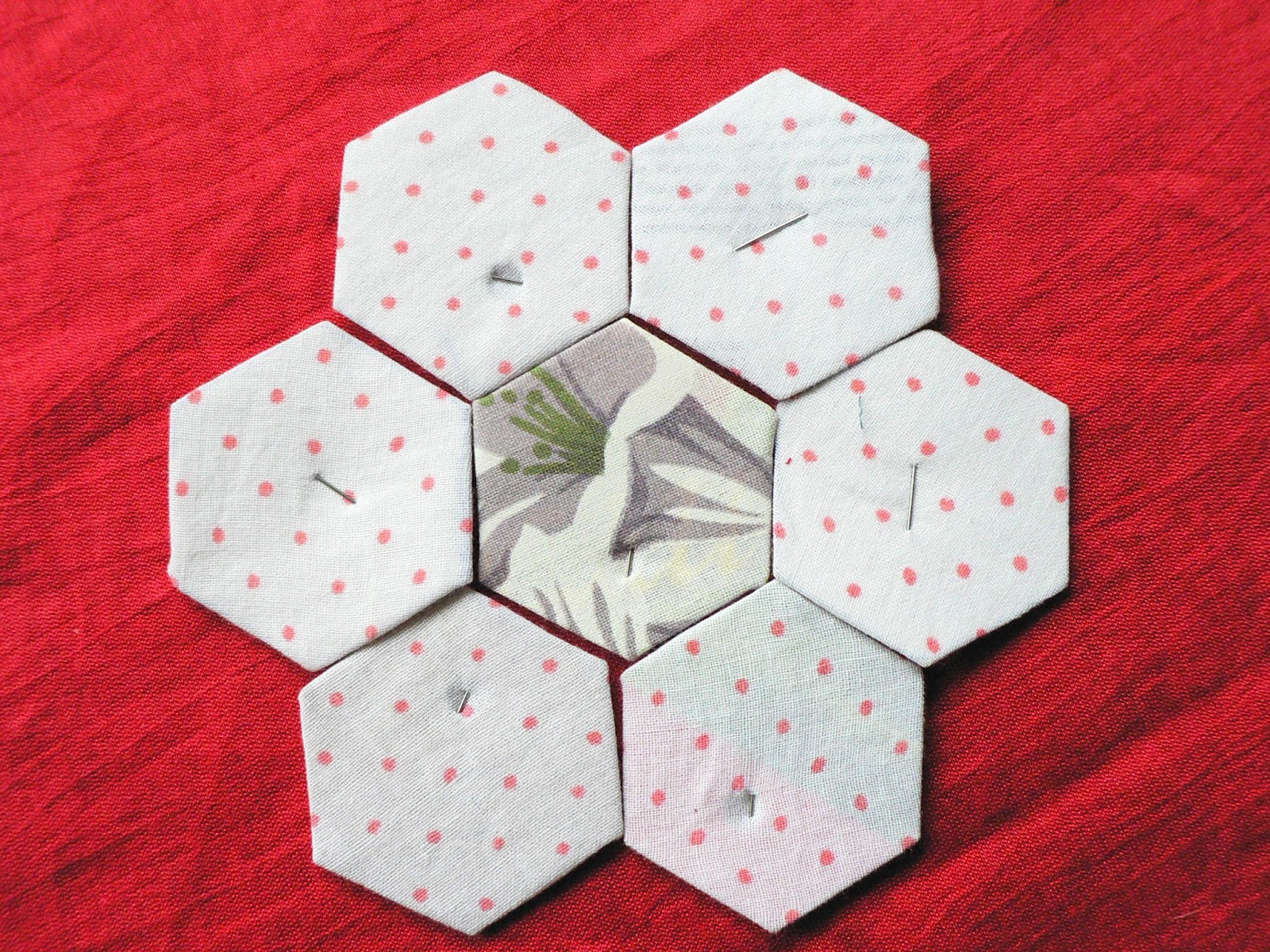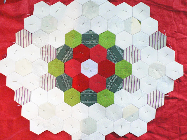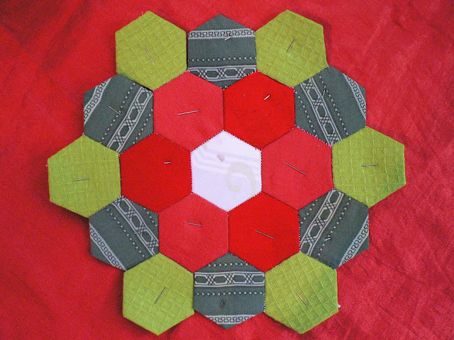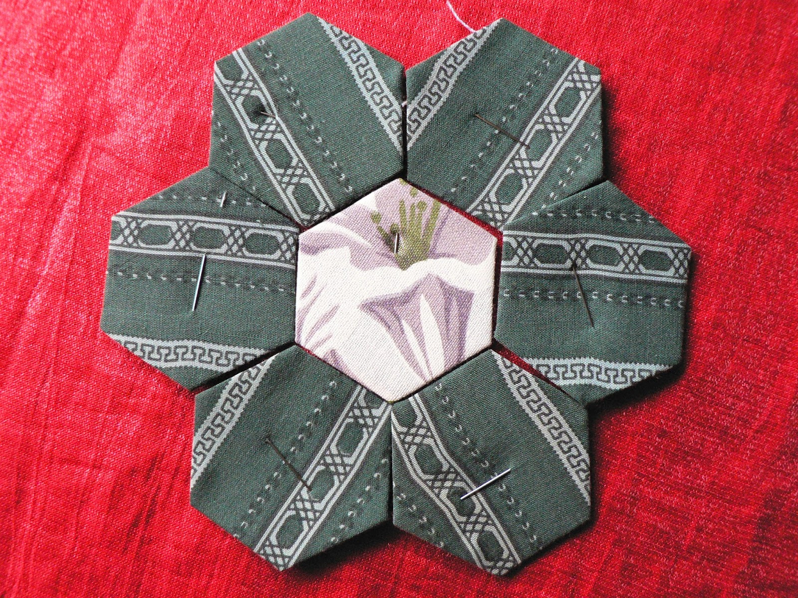 Если лоскутное полотно у Вас большое, вынутые из центра полотна шаблоны могут быть использованы на крайних рядах. На моём примере гексагоны можно без ущерба вынуть из цветочка и зелёных листиков, белые крайние ряды, желательно, оставить не тронутыми, к ним будут добавлены ещё красные цветы: