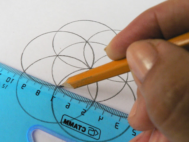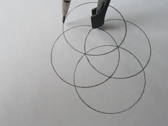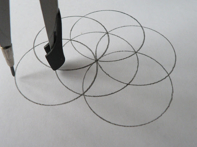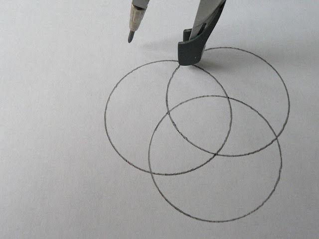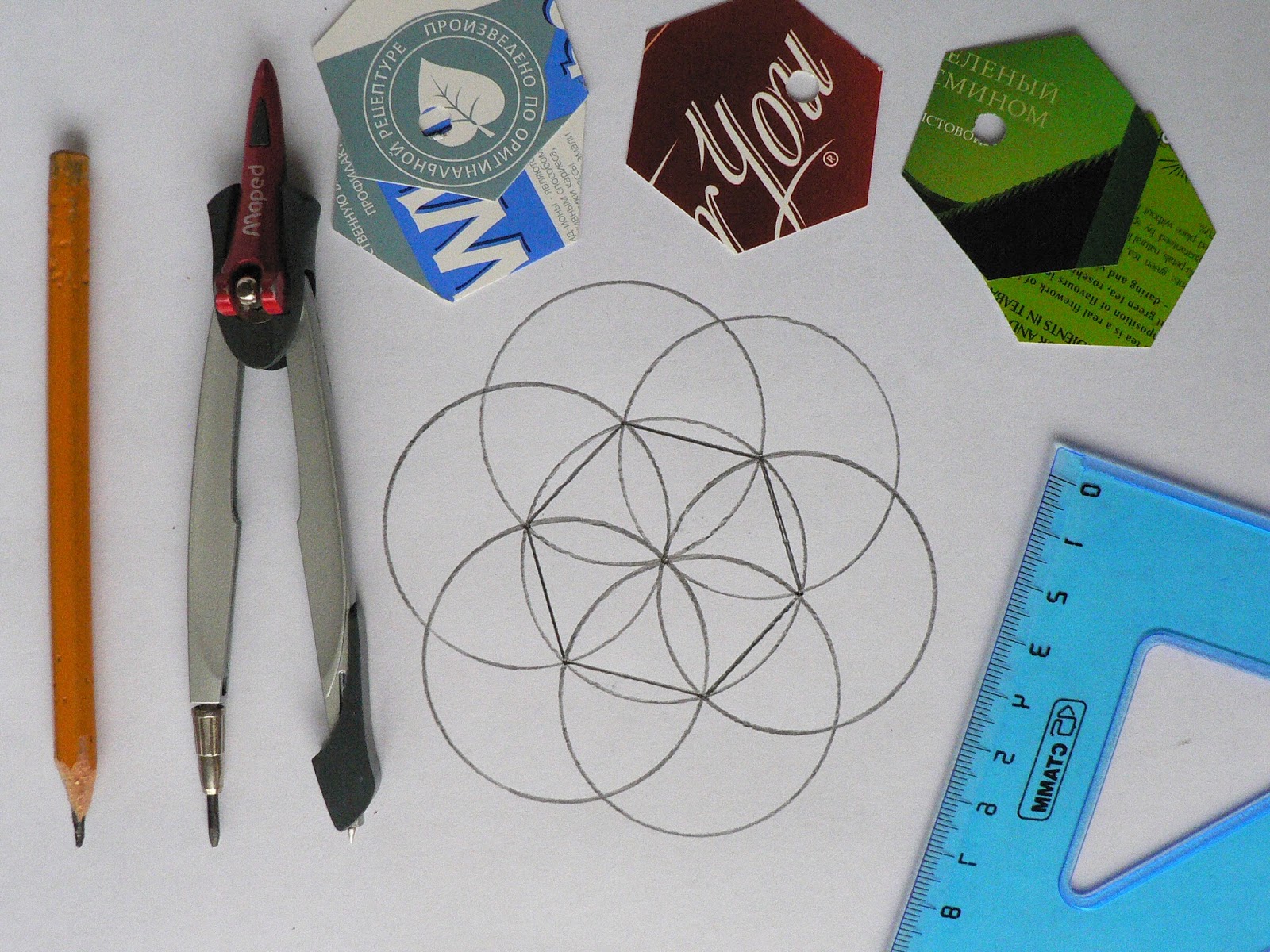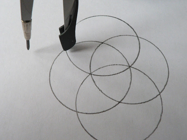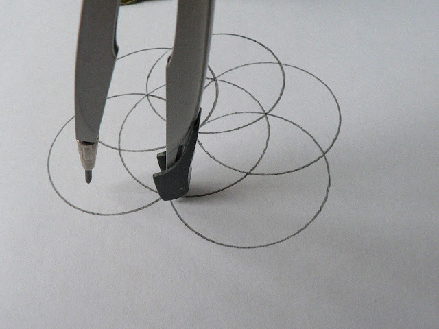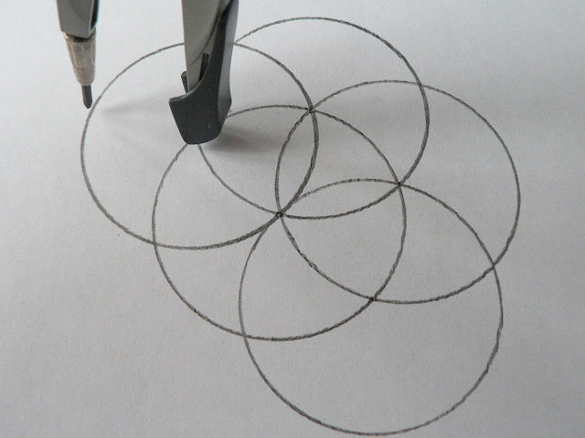Аналогично строим всего 6 окружностей с центром на линиях пересечения с центральным кругом.