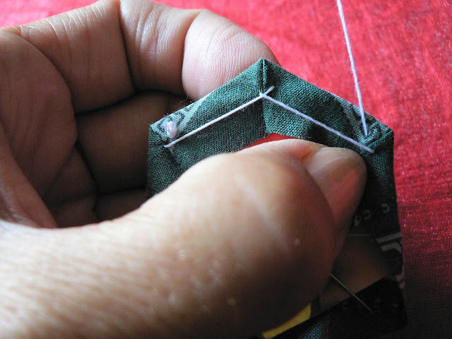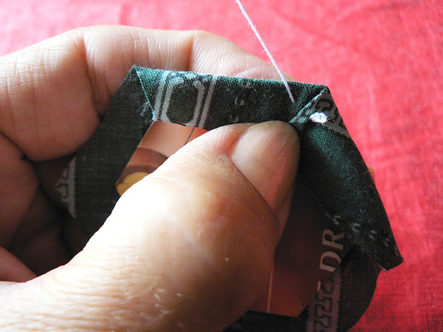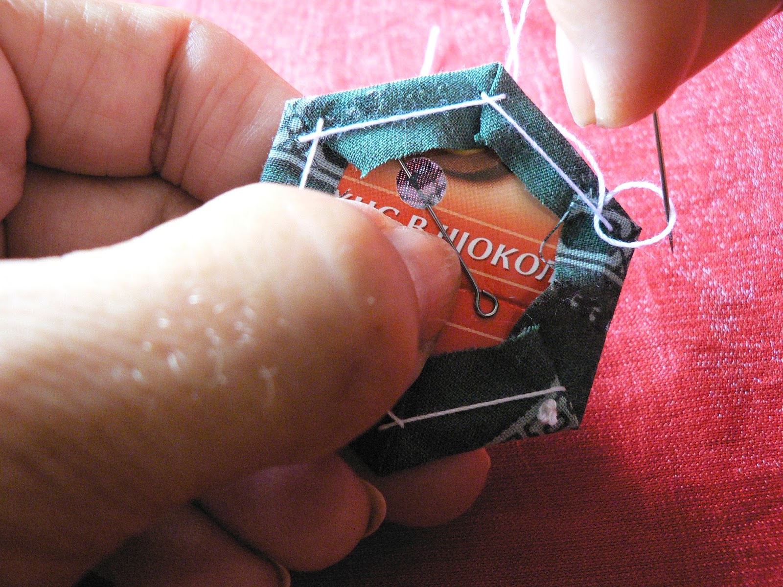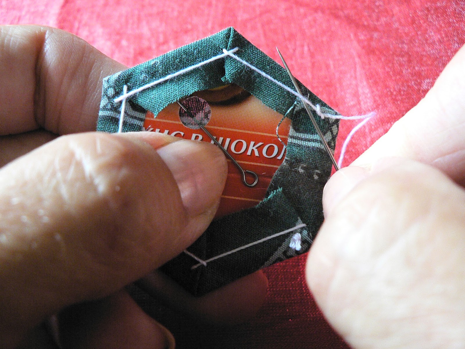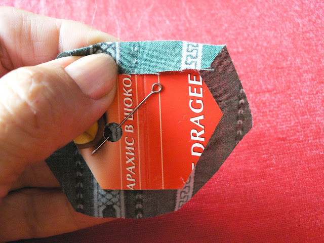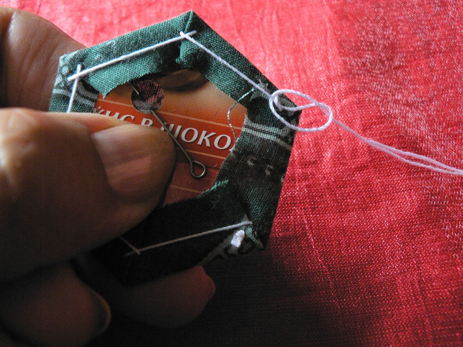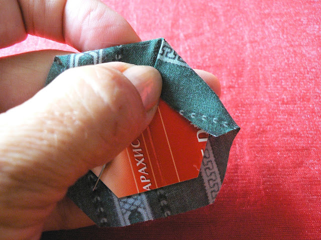 Продолжаем шить шов "иголкой назад" - закрепляем ткань на шаблоне по углам (картон не протыкается - иголка захватывает только сложенную ткань):