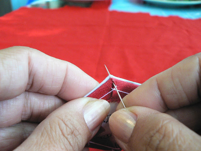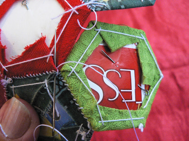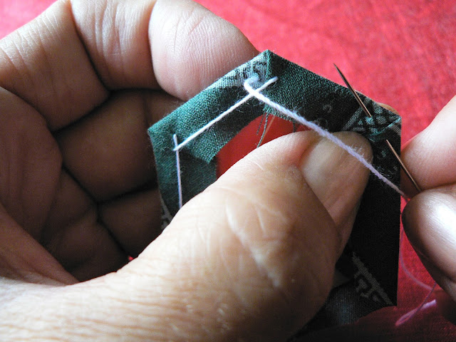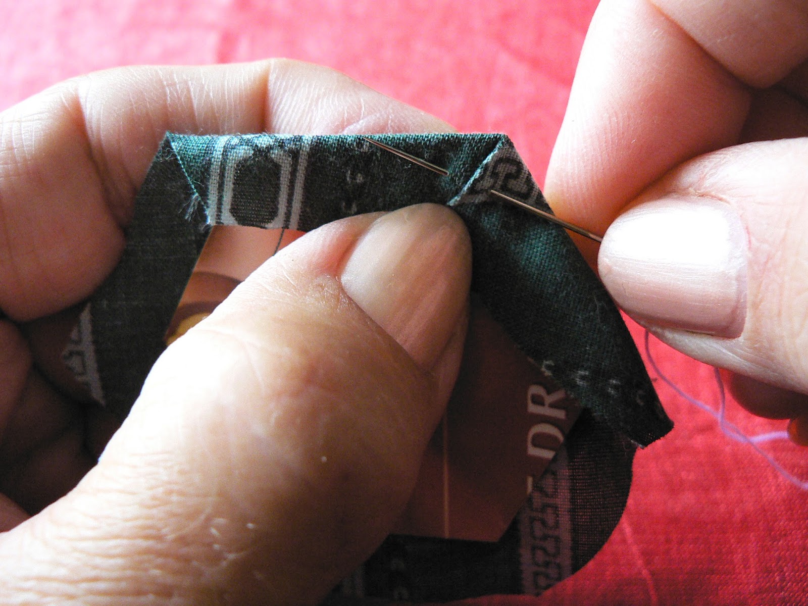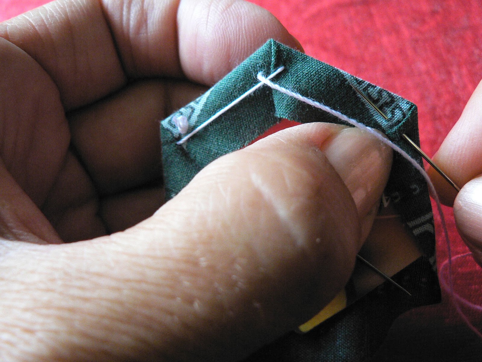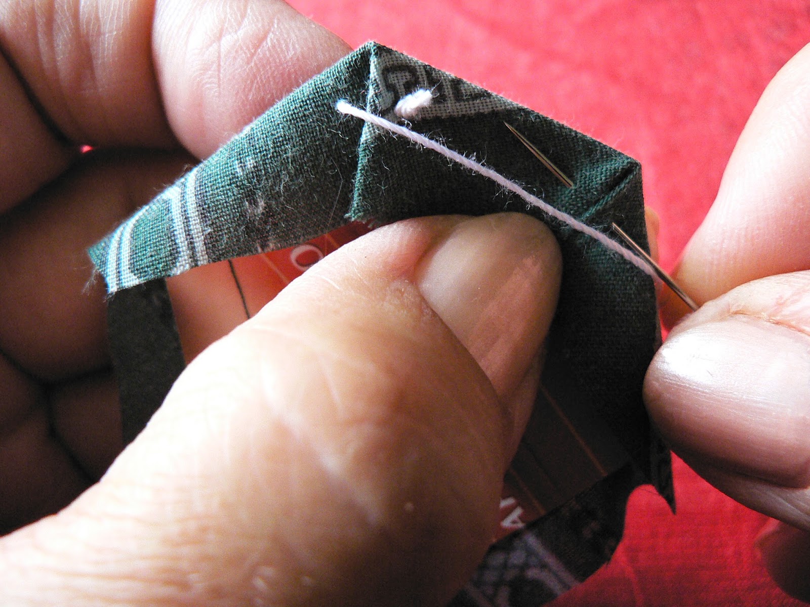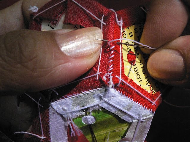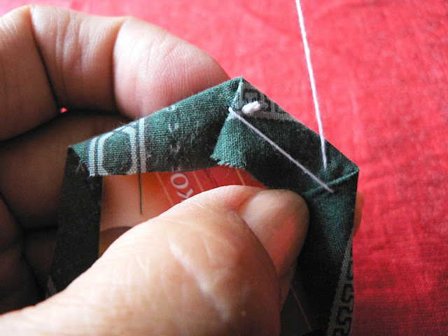 Продолжаем шить шов "иголкой назад" - закрепляем ткань на шаблоне по углам (картон не протыкается - иголка захватывает только сложенную ткань):