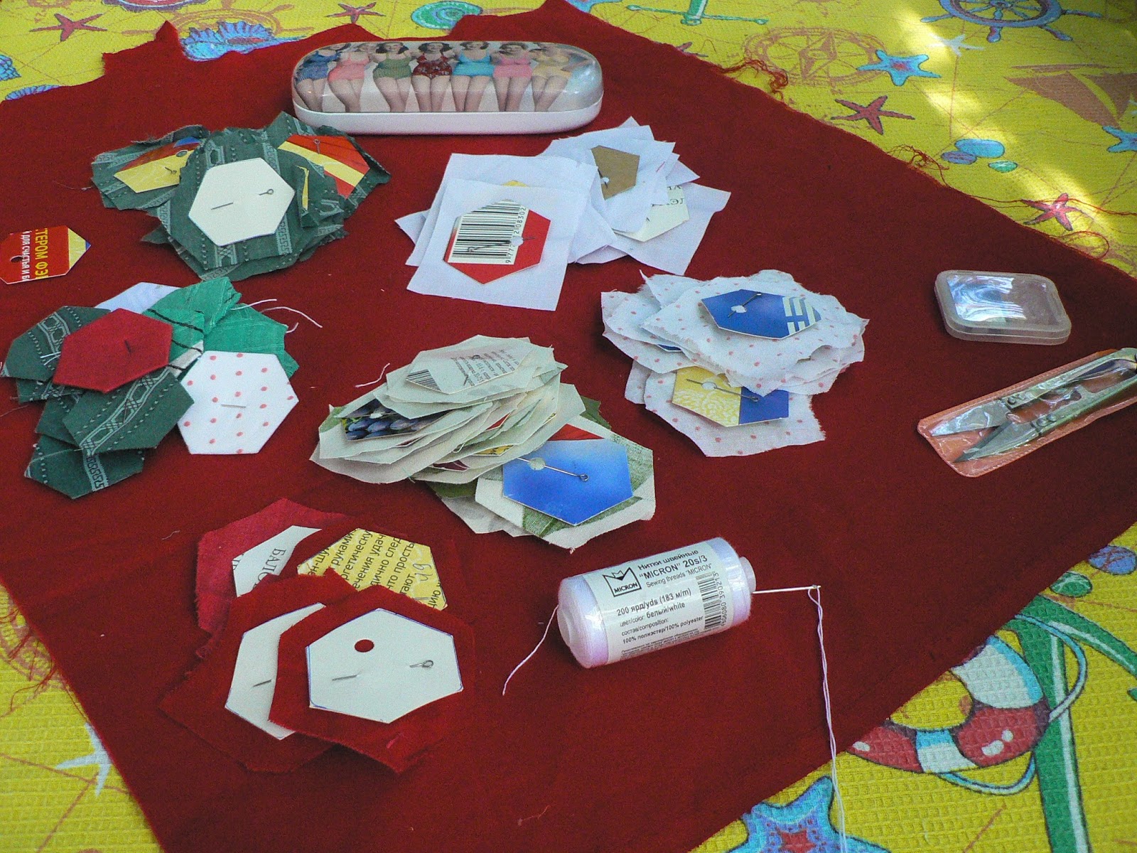Вся прелесть этой неспешной работы в том, что на первоначальном этапе изготовления шестиугольников работа не занимает много места. Ее можно взять с собой в дорогу, в поезд, на дачу или турбазу. Швейная машинка не нужна! Вот я и взяла заготовки на дикую турбазу на острове на Волге....
