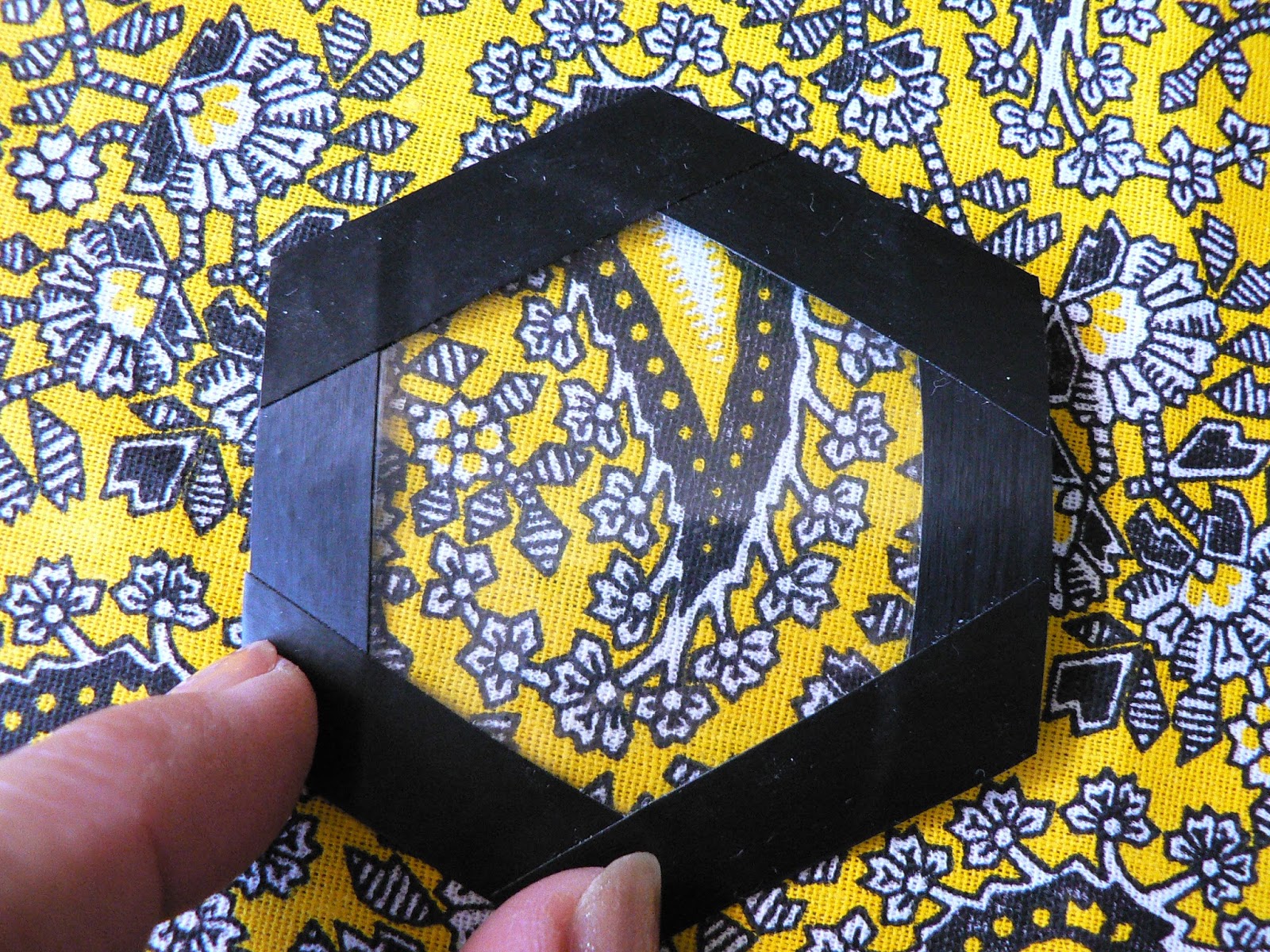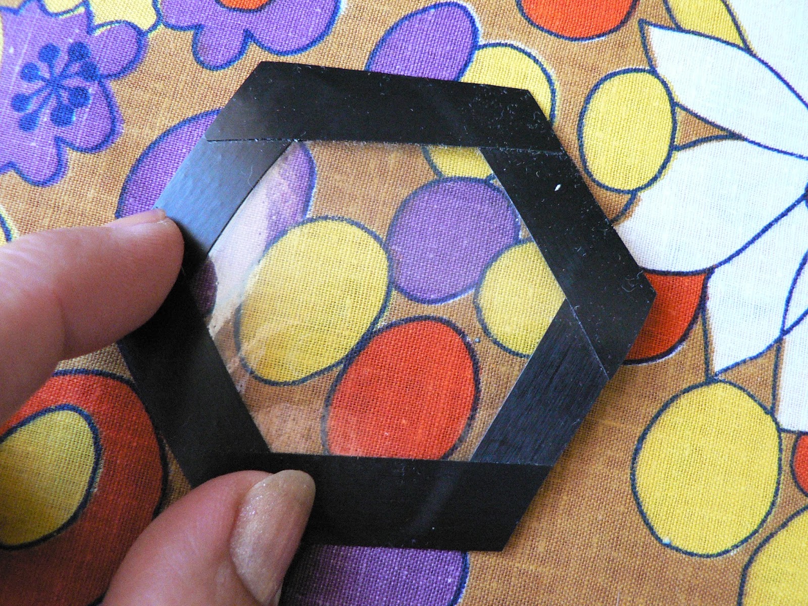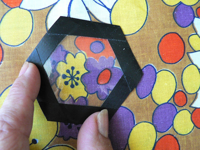 Вырезаем из пластика (бутылка или канцелярская папка-уголок) гексагон с припусками и заклеиваем по краю изолентой припуск на подгиб.