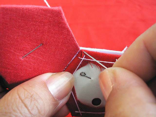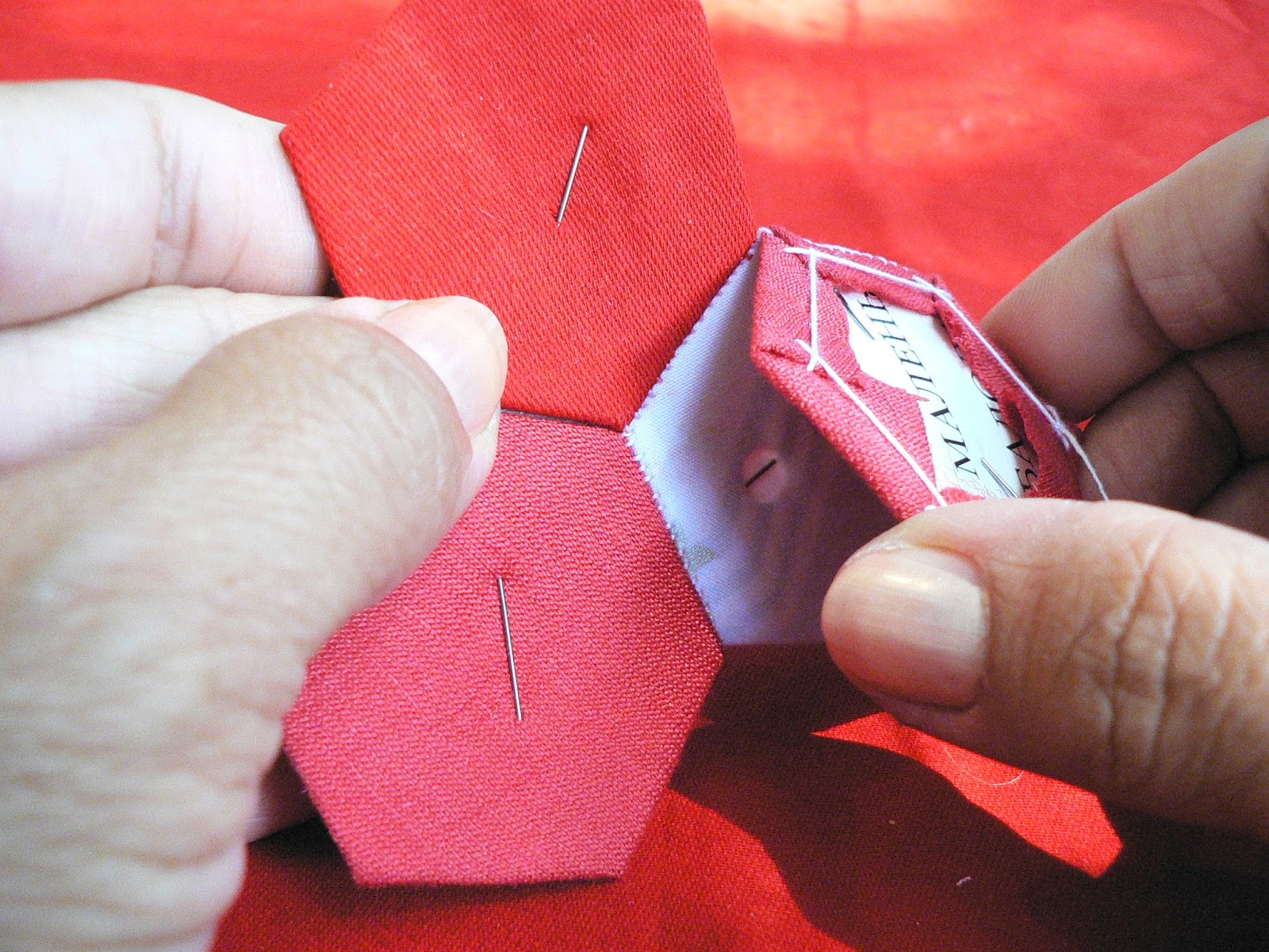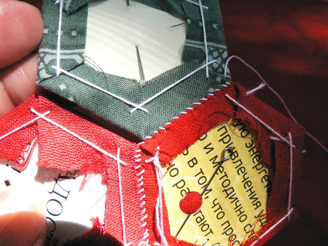 Если в процессе шитья окажется, что стороны соседних шестиугольников слегка отличаются по размеру (это значит, что вы не лазерный принтер или не компьютерный резак) - не расстраивайтесь! Слегка подтяните короткую сторону за уголок к уголку и она вытянется до нужного размера, а большая сторона ужмётся...