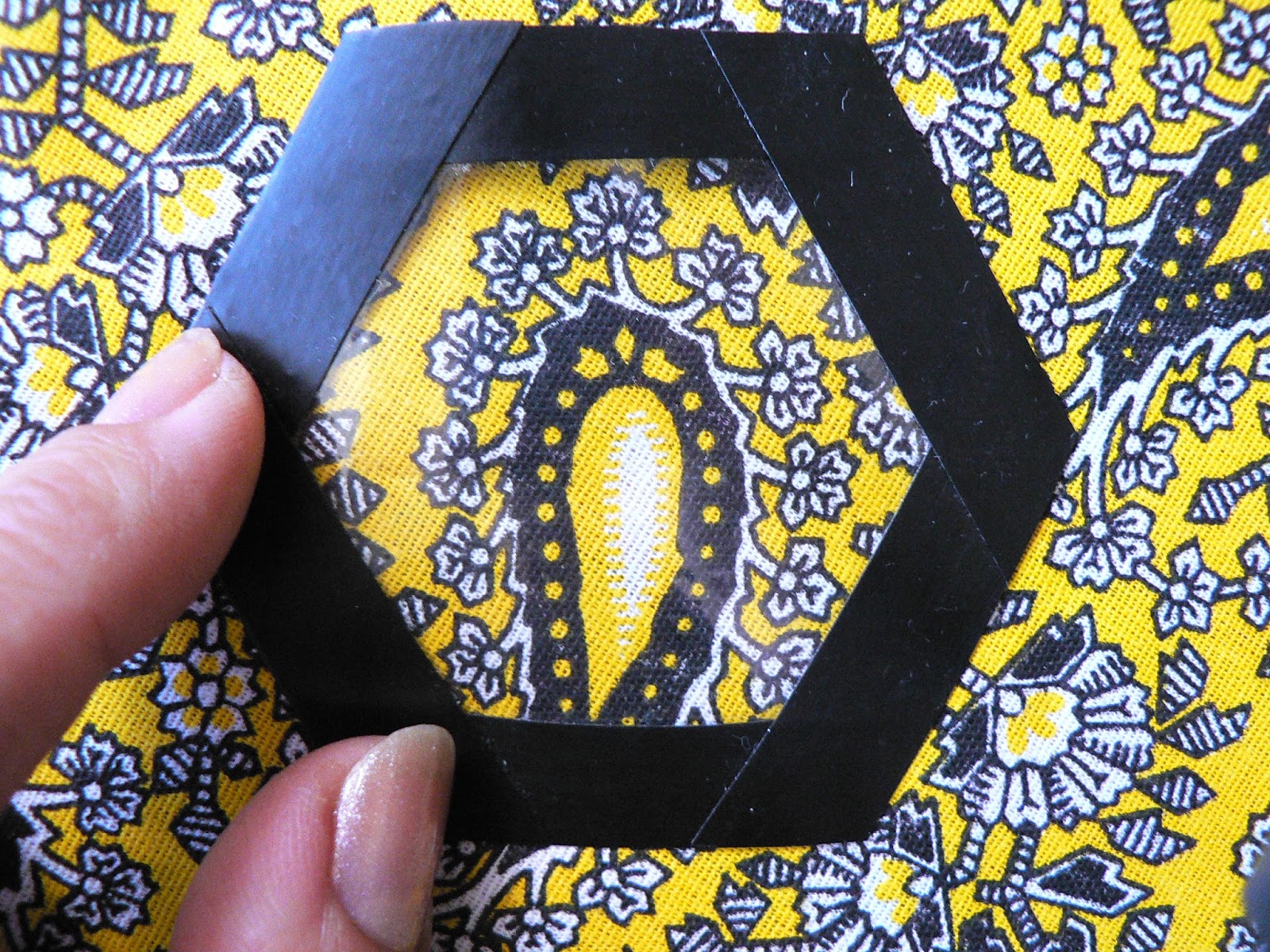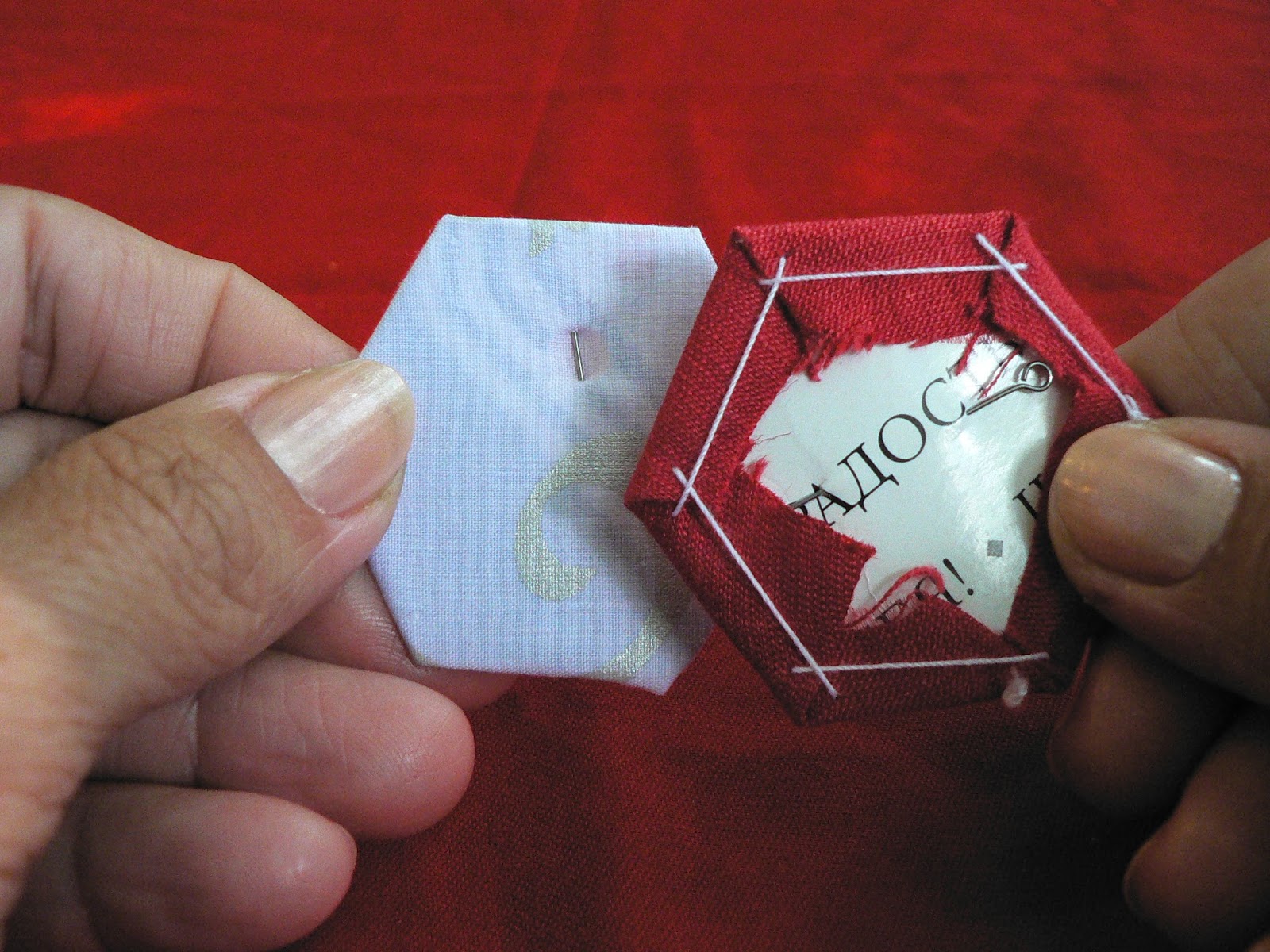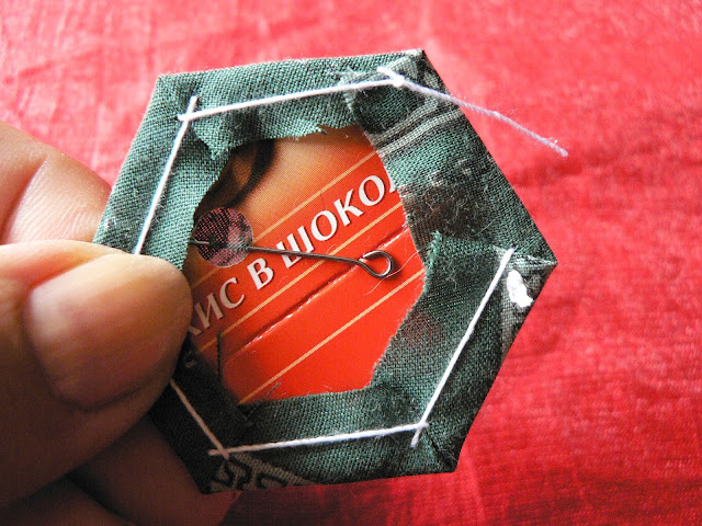 Важно не перетягивать ткань, а просто загибать припуски на картон. Иначе по рисунку пойдёт волна. Такой кривой гексагон не очень подойдёт в работе...