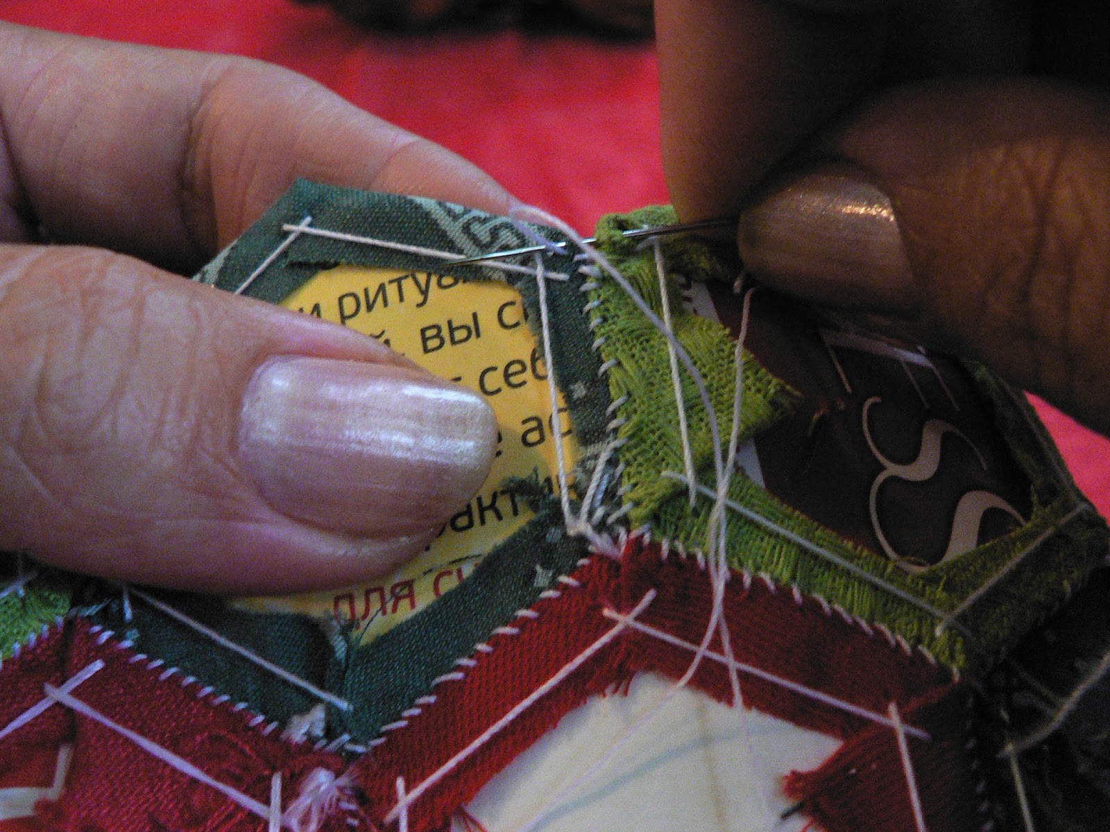 Нитки можно использовать любые, но лучше светлые, чтобы они не просвечивали, если ткань светлая. Чтобы нити при работе не завязывались в петли, полезно иметь при себе кусочек воска и каждый раз перед работой проводить нить между воском и вашим пальцем.