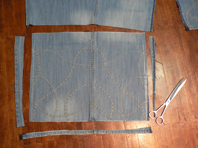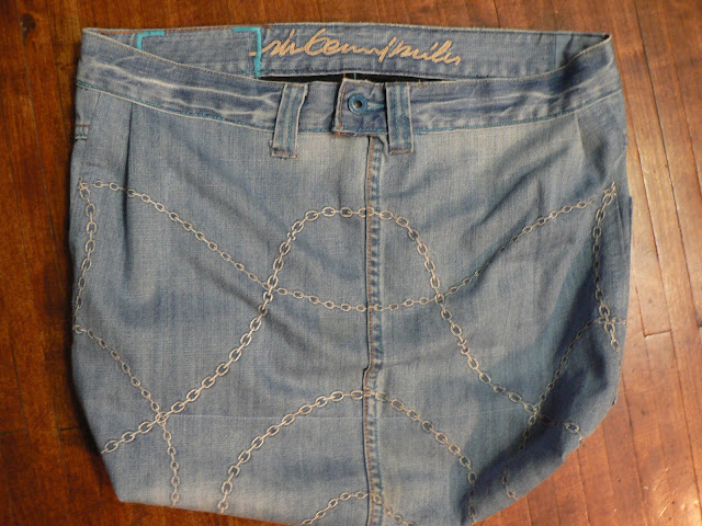 Мне отдали на растерзание широкие большие женские джинсы с вышивкой. Отпарываем пояс 96 х 5 см, шлёвки оставляем на поясе: